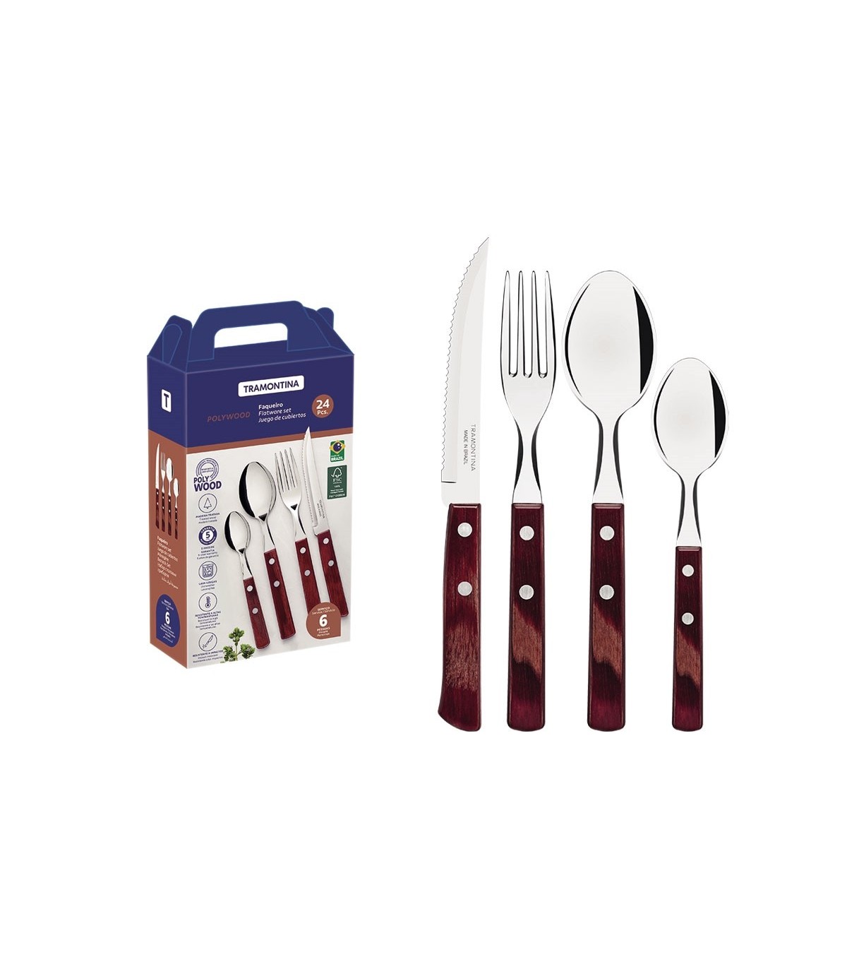 Tramontina Polywood -mallisto yhdistää maalaismaisen tyylin ja korkean suorituskyvyn käsitellyillä puukahvoilla, jotka kestävät kulutusta, kosteutta ja iskuja. Ruostumattomasta teräksestä valmistetut terät takaavat tarkat ja turvalliset leikkaukset, joten ne sopivat täydellisesti jokapäiväiseen käyttöön tai erityistilaisuuksiin.